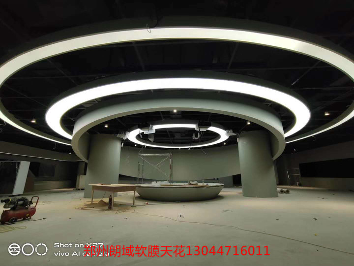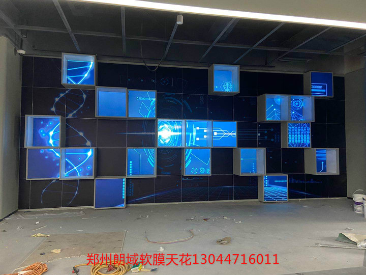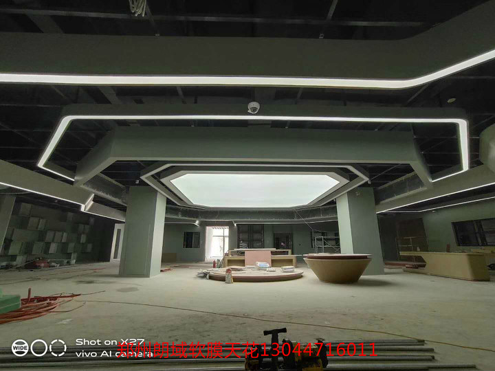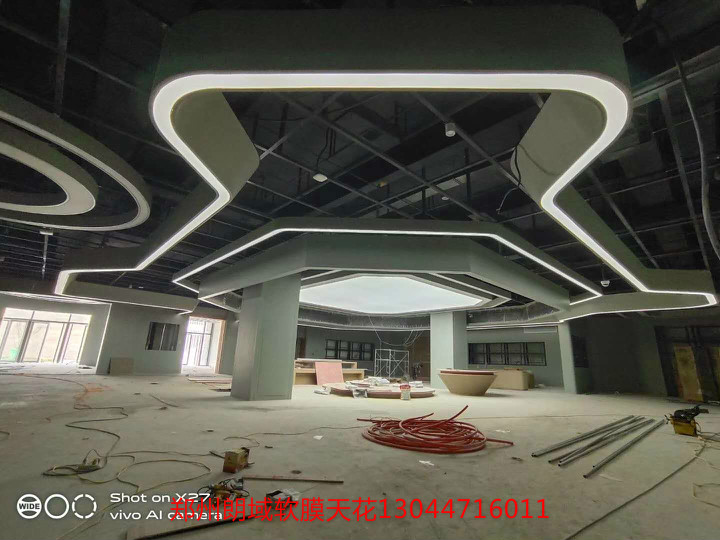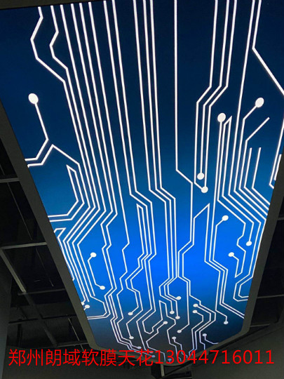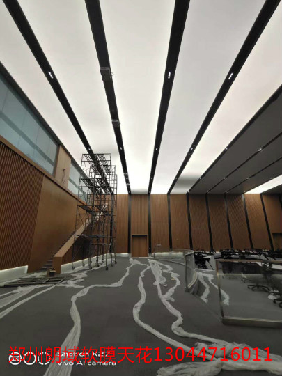 白色透光膜,UV噴印圖案軟膜。大面積發(fā)光頂棚,窄條光帶造型,發(fā)光墻噴印軟膜展示。